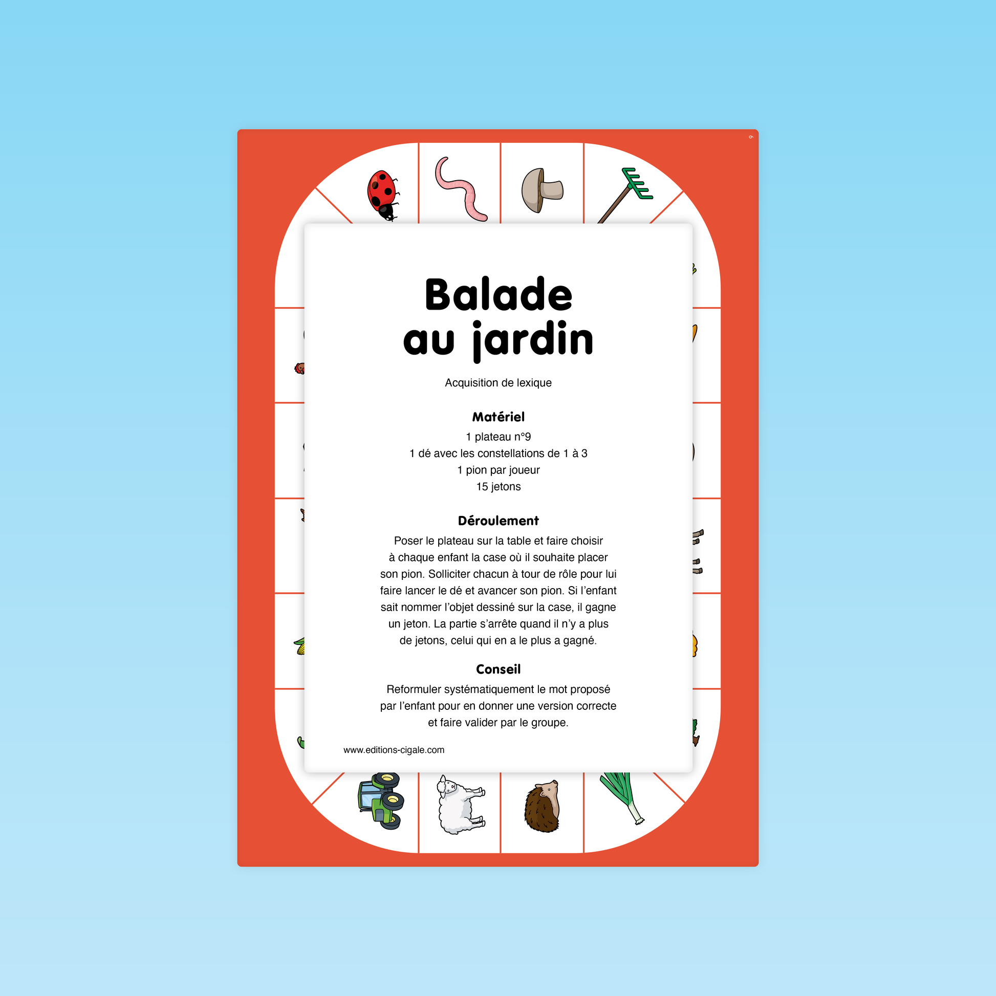Balade au jardin est un jeu de plateau conçu pour développer le vocabulaire des élèves de petite section à partir d’illustrations simples et familières. En avançant leur pion sur le plateau, les enfants observent les images et doivent nommer les éléments représentés : animaux, plantes, outils ou légumes du jardin. Cette situation ludique encourage les premières prises de parole et la mobilisation du lexique. Facile à organiser en petit groupe, l’activité permet à l’enseignant d’accompagner les productions orales par la reformulation et la validation collective des mots.