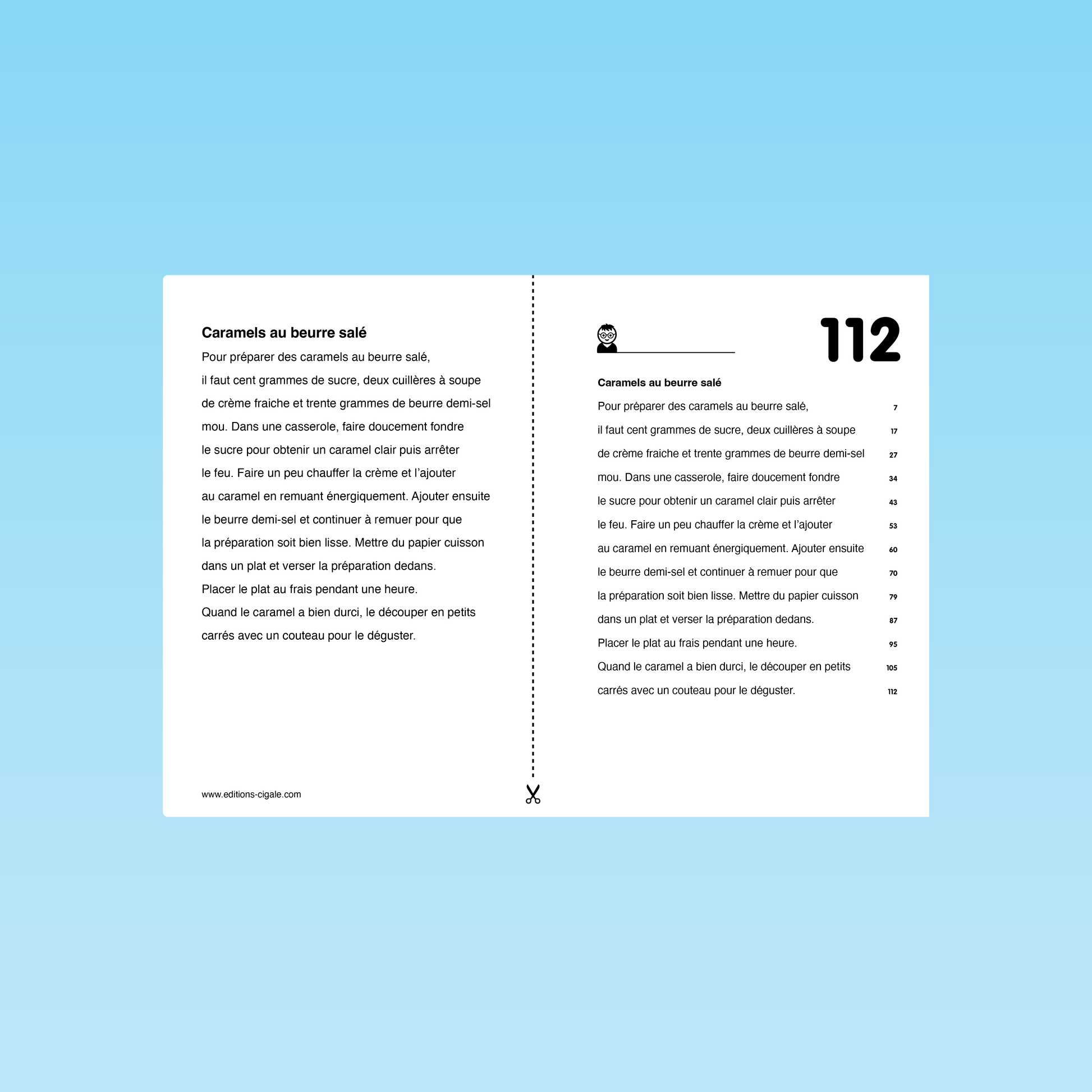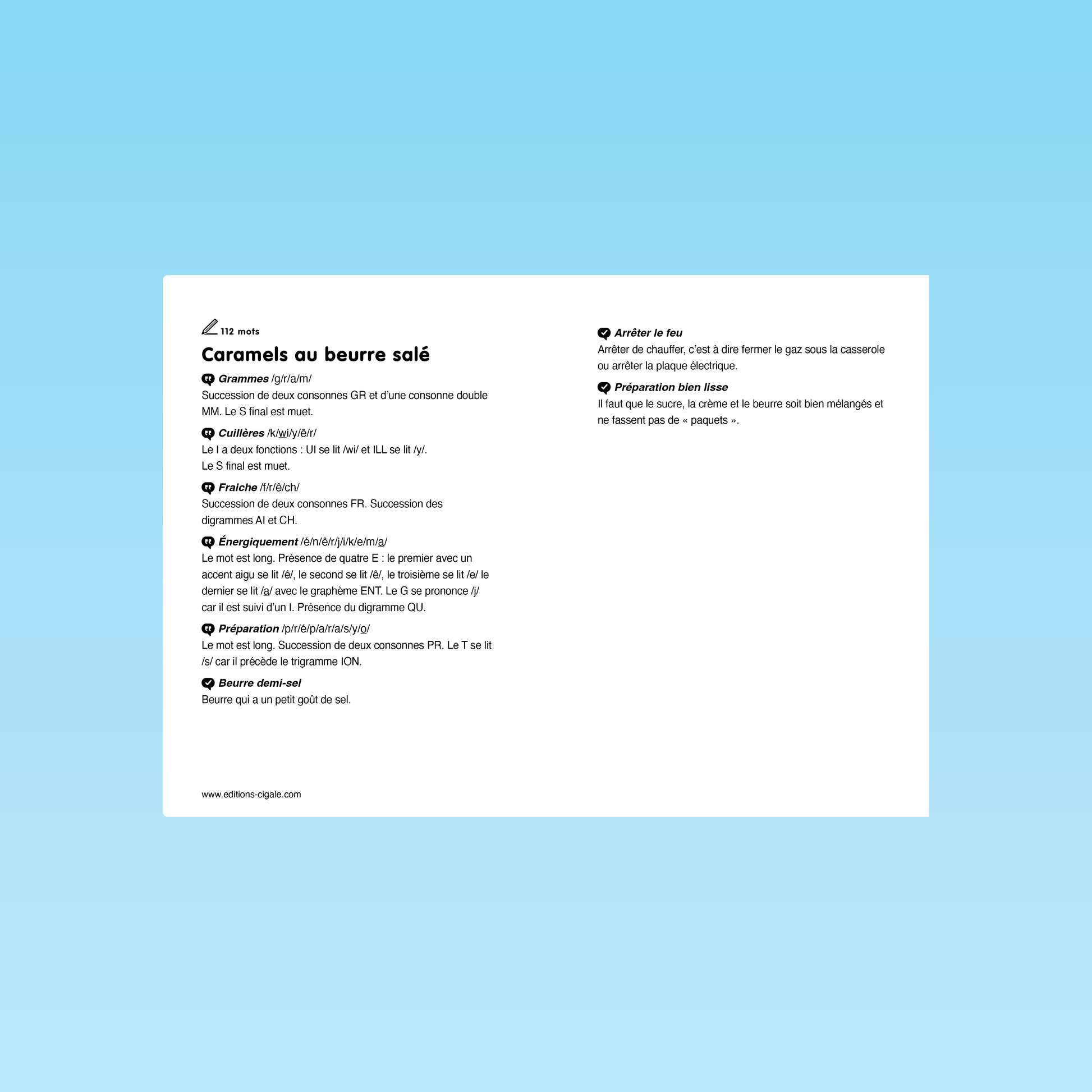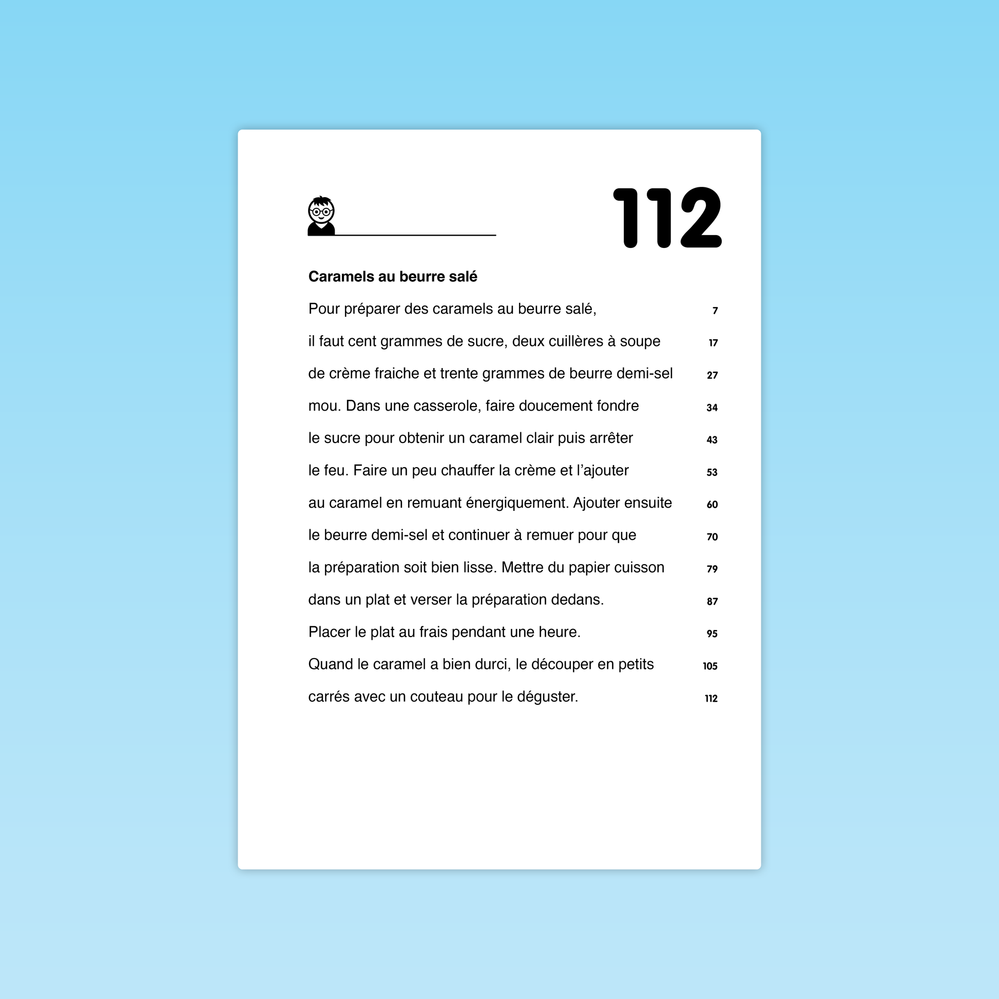 Ce texte de fluence propose aux élèves une courte recette : la préparation de caramels au beurre salé. Le texte, composé de 112 mots, guide pas à pas les étapes de la recette, depuis la fonte du sucre jusqu’à la découpe des caramels prêts à être dégustés. Sa structure simple et narrative permet aux élèves de s’entraîner à lire avec fluidité tout en suivant une situation concrète et familière. Le repérage progressif des mots facilite les lectures chronométrées et la mesure des progrès. Des indications phonologiques accompagnent certains mots afin de soutenir le décodage et d’attirer l’attention sur des graphèmes ou particularités orthographiques.