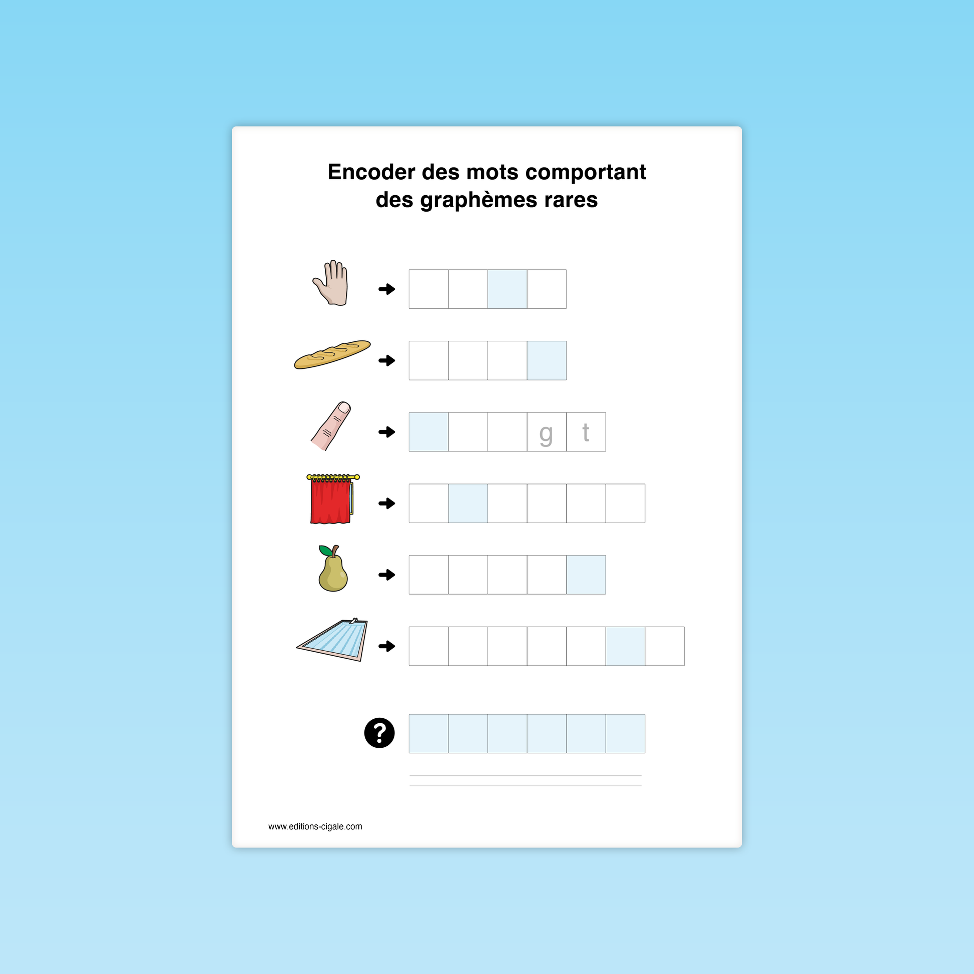 Quand les élèves ont consolidé les graphèmes fréquents, certains mots résistent encore : ceux qui mobilisent des graphèmes plus rares (gn, ill, ph, eau, ge…). Ces fiches proposent d’encoder des mots à partir d’images (rose, drapeau, scie, rideau, doigt…), en portant une attention particulière au graphème ciblé. Les cases matérialisent chaque phonème et rendent visible l’endroit précis où intervient l’écriture moins fréquente. En atelier dirigé, l’enseignant accompagne l’analyse : « Ce son, l’avons-nous déjà écrit autrement ? » Un entraînement structuré pour affiner la vigilance orthographique.
