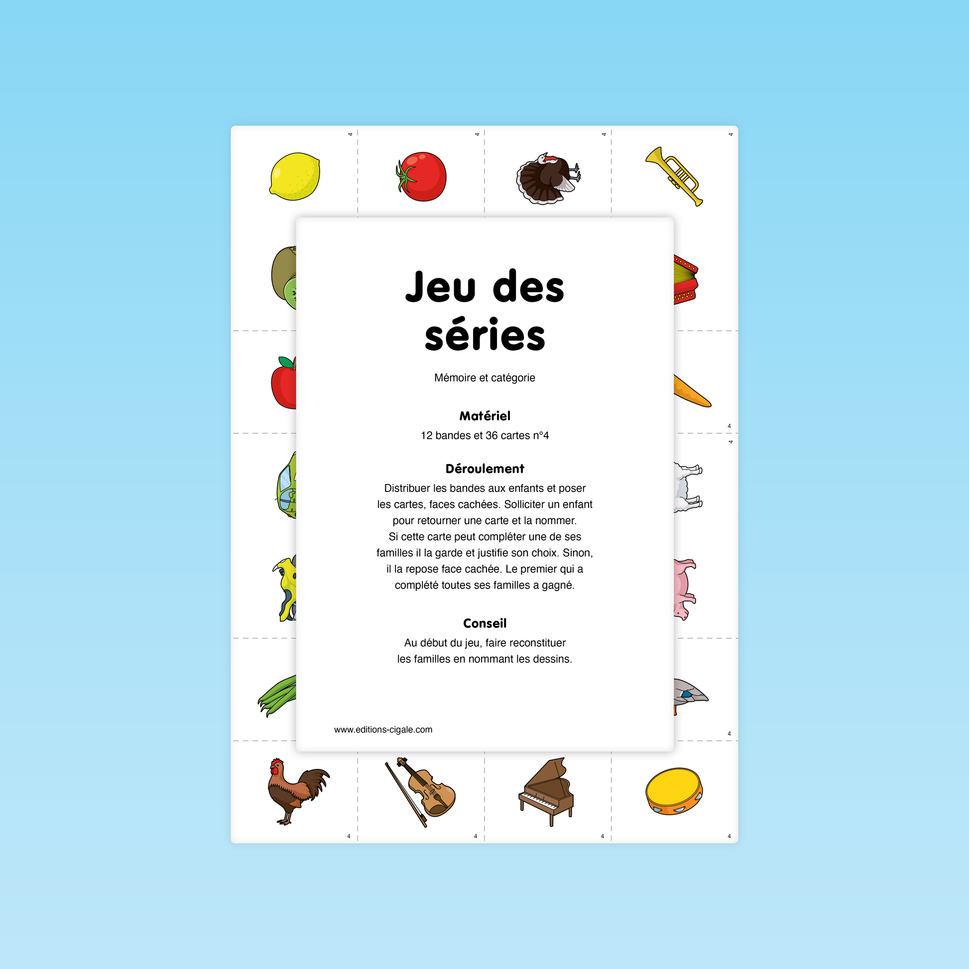 Avec le Jeu des séries, les élèves de moyenne section apprennent à organiser les mots en catégories et à compléter des familles d’objets. Chaque enfant dispose d’une bande illustrée représentant une catégorie (fruits, animaux, instruments de musique, outils, véhicules…). En retournant les cartes à tour de rôle, il cherche celles qui complètent sa série. Lorsqu’une carte correspond à sa catégorie, il la nomme et explique son choix. Cette activité combine mémoire, observation et langage oral. En manipulant les images et en verbalisant les liens entre les objets, les élèves structurent progressivement leur vocabulaire.