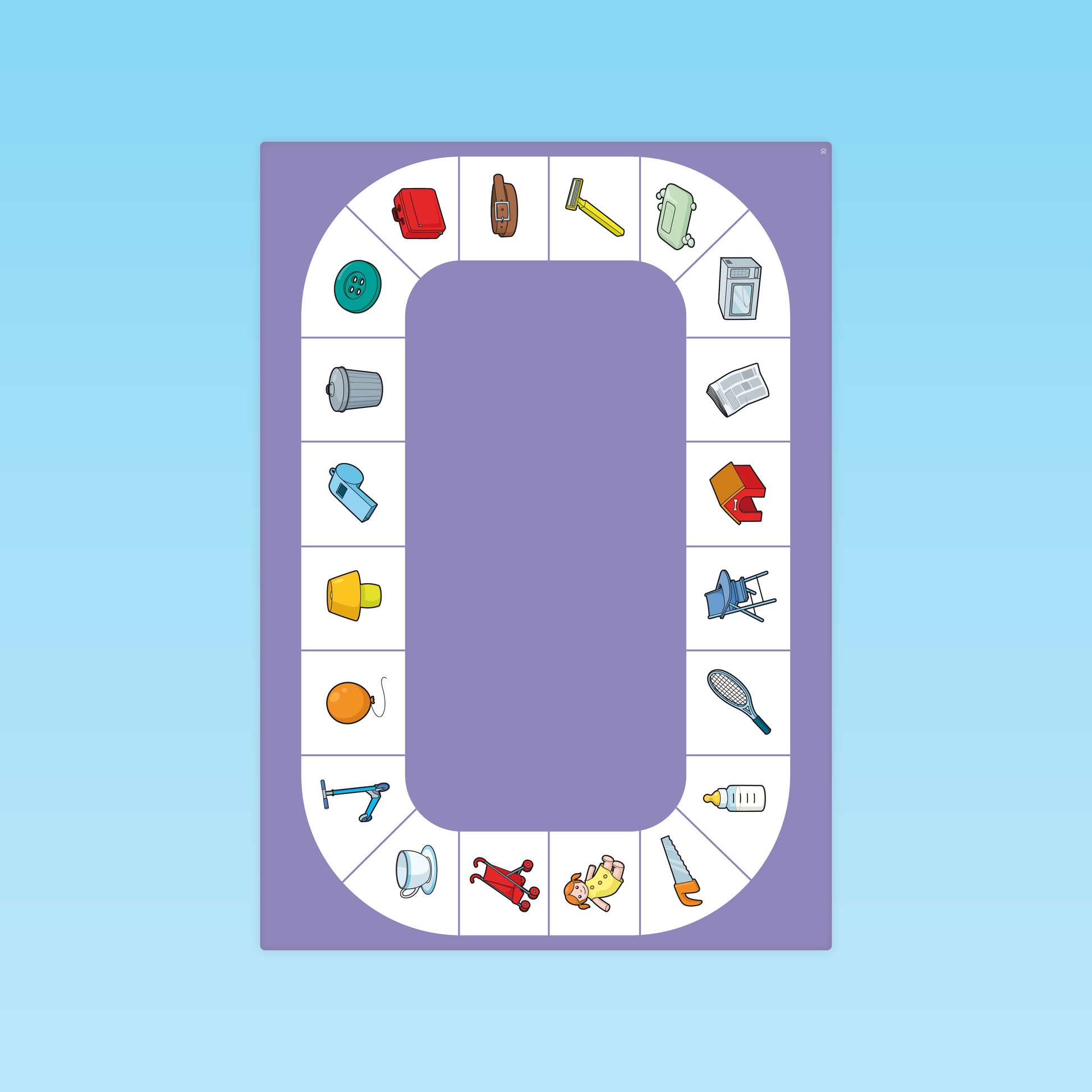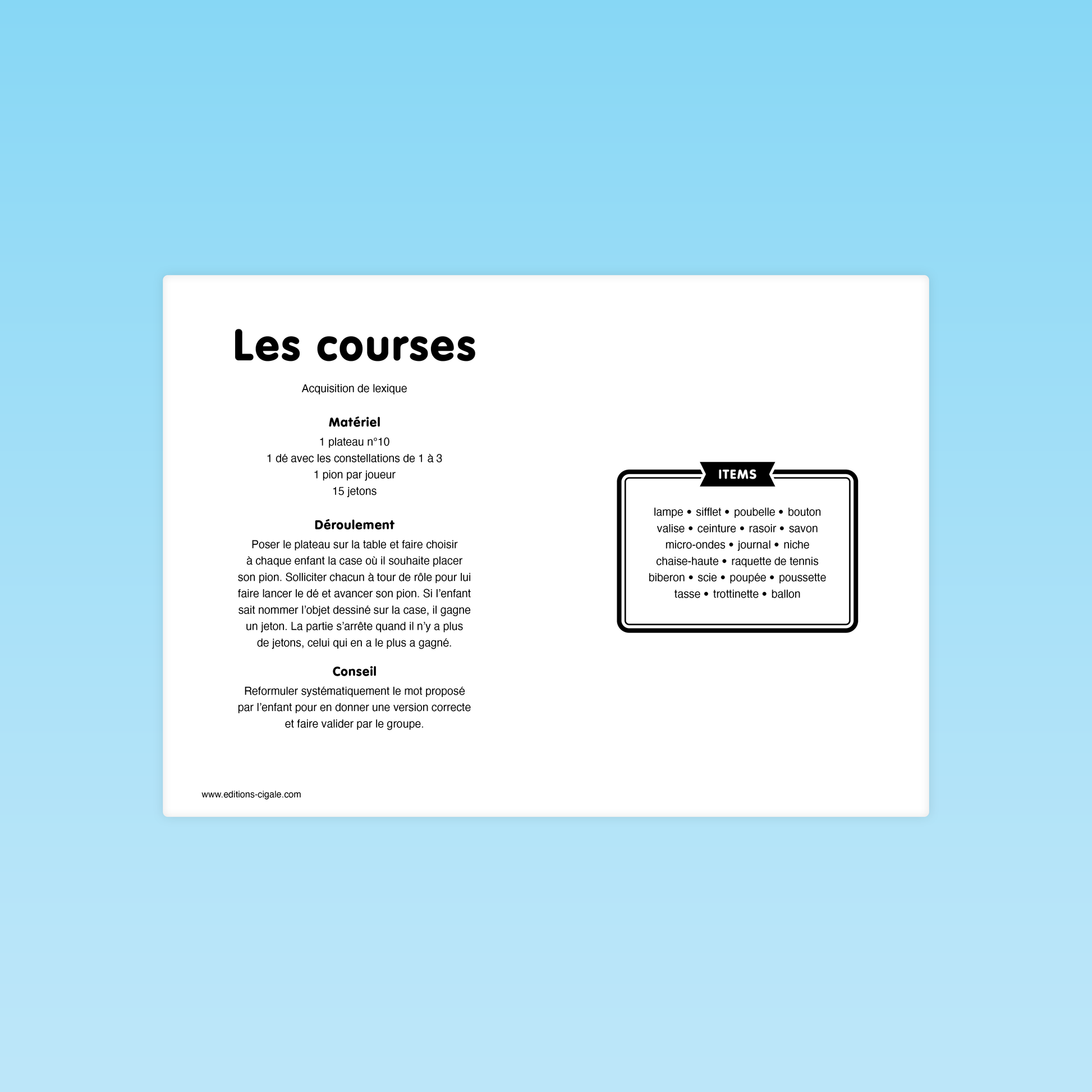Les courses est un jeu de plateau conçu pour enrichir le vocabulaire des élèves de petite section à partir d’objets du quotidien. En avançant leur pion sur le plateau, les enfants observent les illustrations et tentent de nommer les objets représentés : ballon, valise, rasoir, poussette ou encore micro-ondes. Cette activité ludique crée de nombreuses occasions de prise de parole et encourage les élèves à mobiliser leur vocabulaire. Facile à mettre en place en petit groupe, le jeu permet à l’enseignant d’accompagner les productions orales par la reformulation et la validation collective des mots.