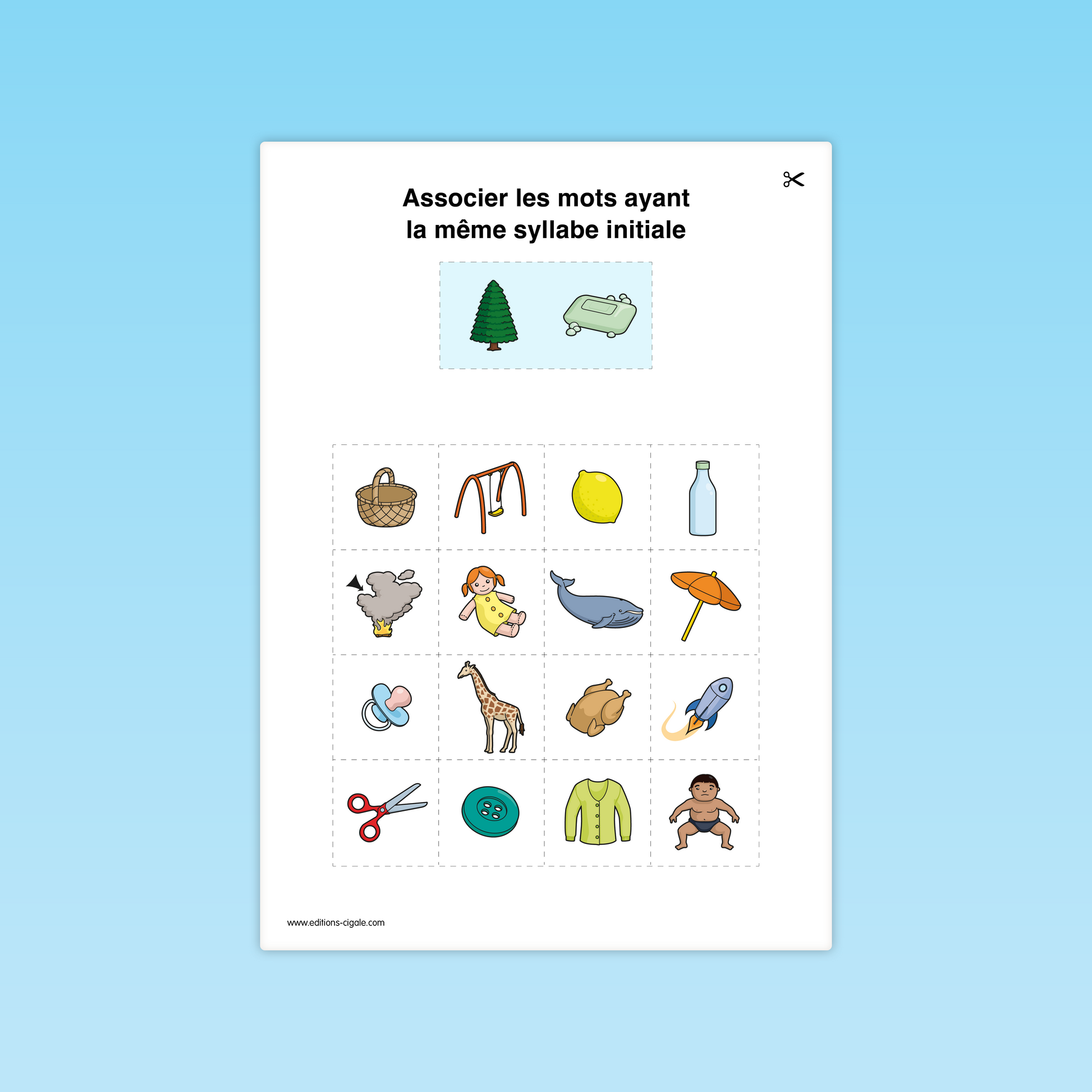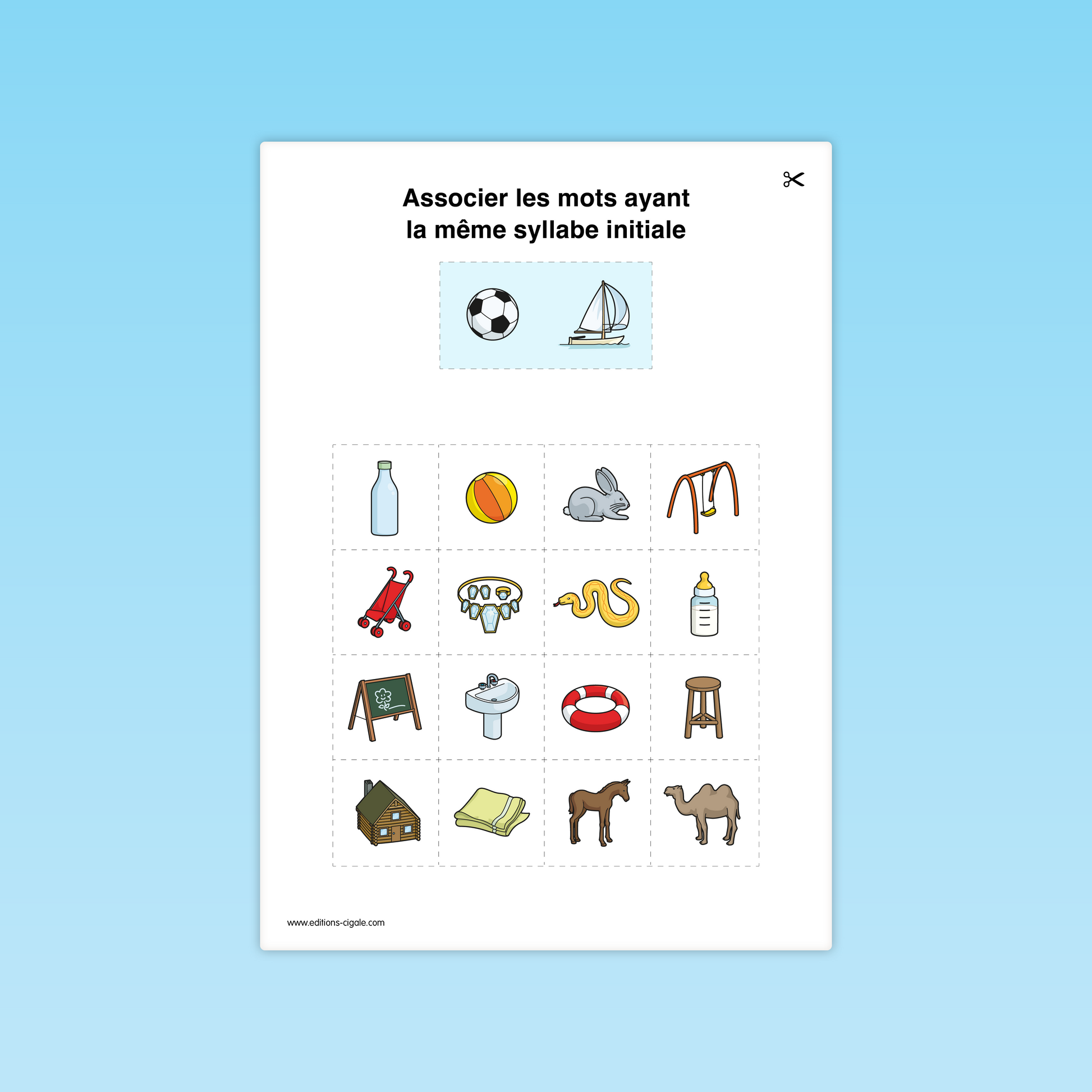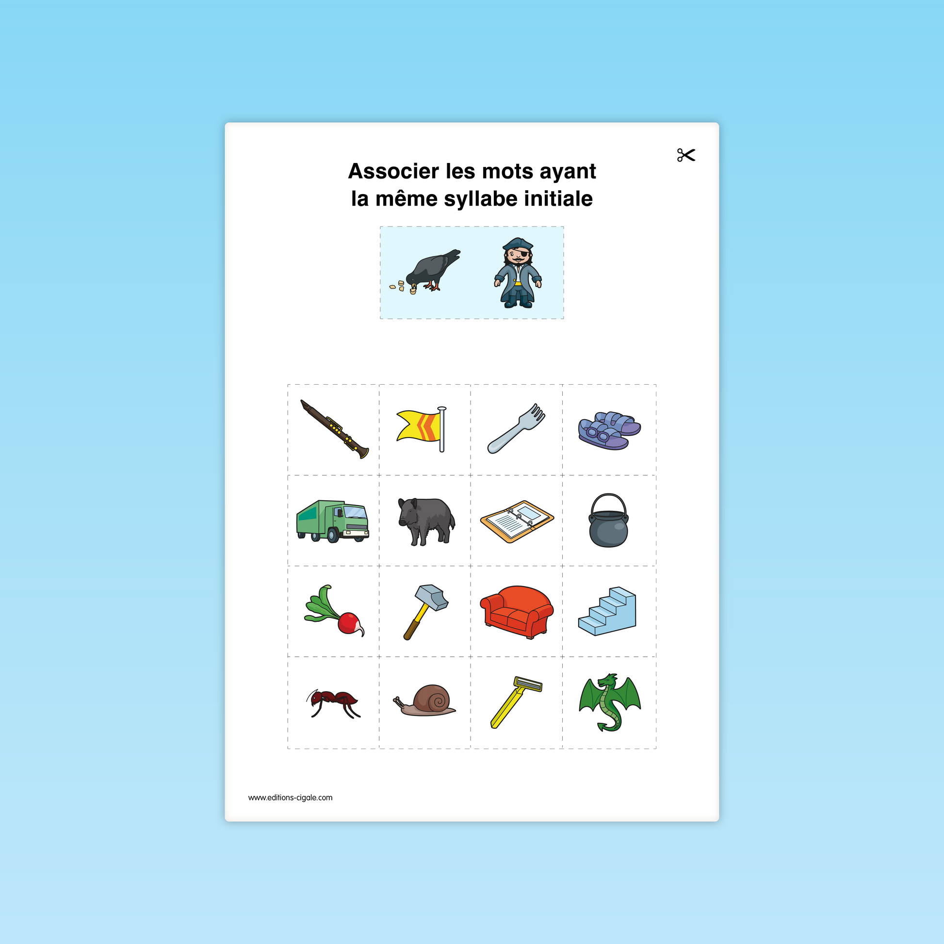 Téléchargeable immédiatement, une série d’exercices autonomes pour apprendre à reconnaître les syllabes initiales ou finales communes à plusieurs mots.Un outil efficace pour renforcer la conscience phonologique et préparer les élèves du CP à l’entrée dans le code écrit.