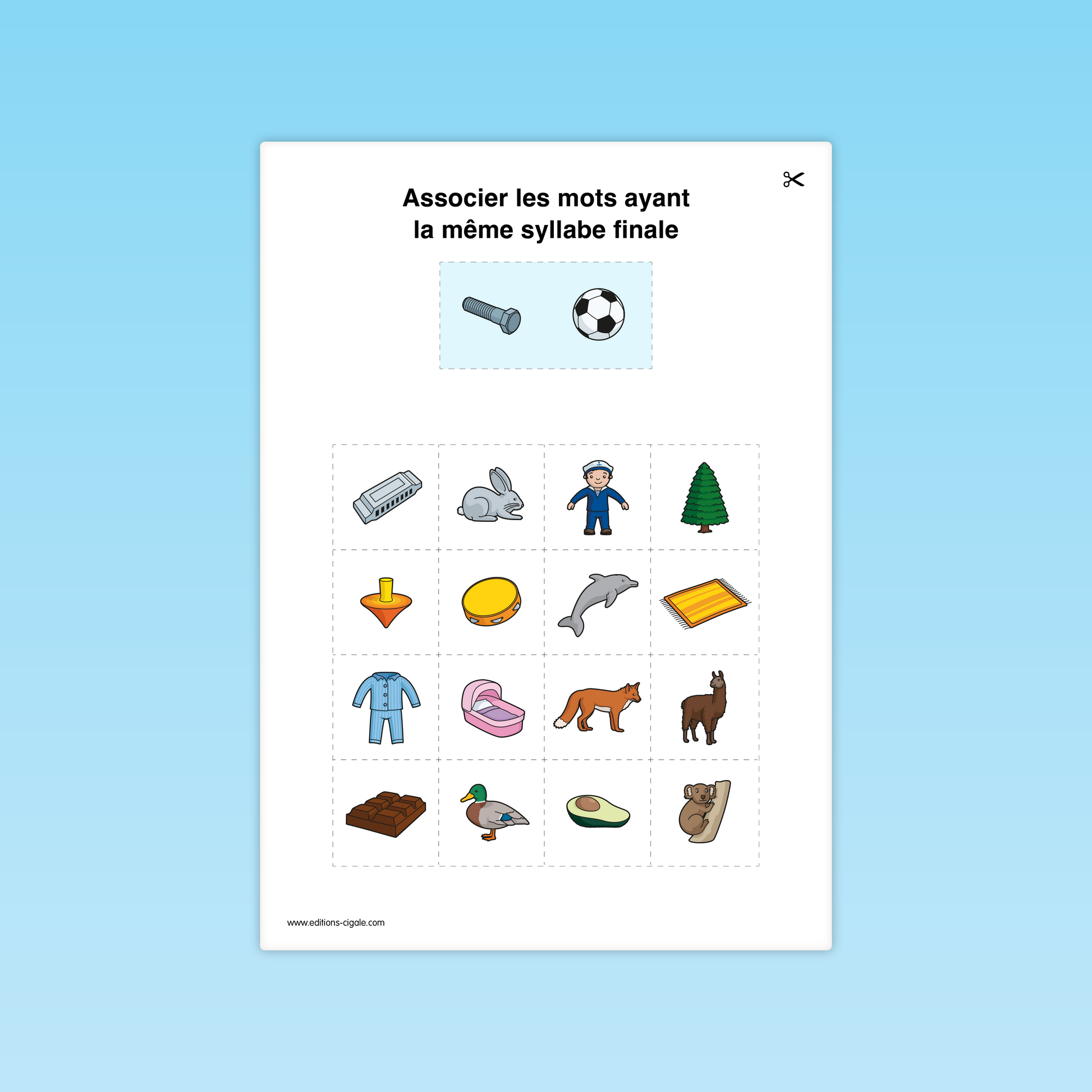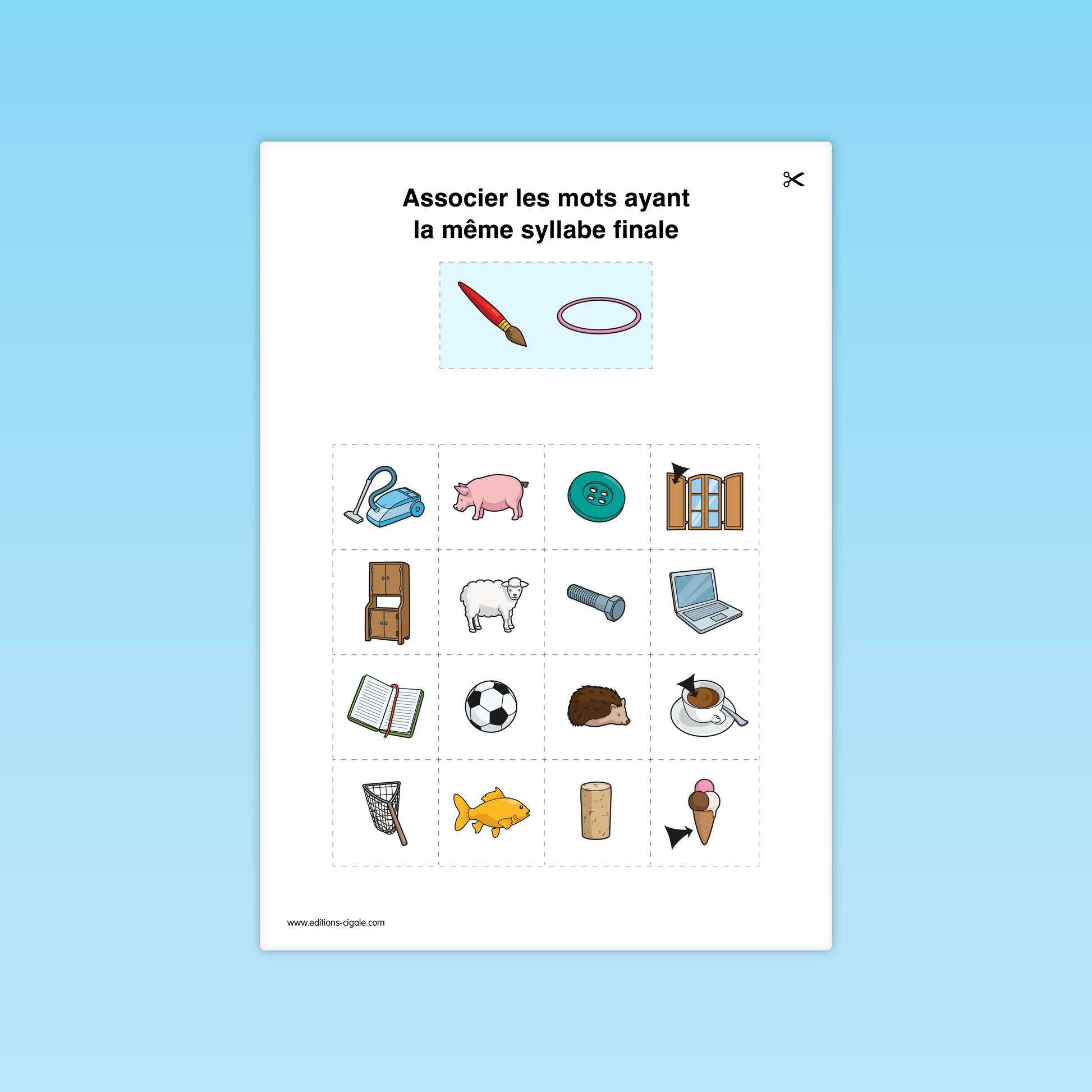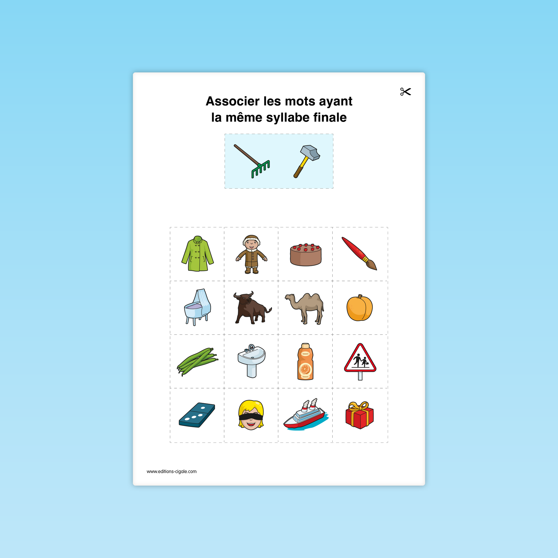 Téléchargeable immédiatement, une série d’exercices autonomes pour apprendre à reconnaître les syllabes initiales ou finales communes à plusieurs mots.Un outil efficace pour renforcer la conscience phonologique et préparer les élèves du CP à l’entrée dans le code écrit.